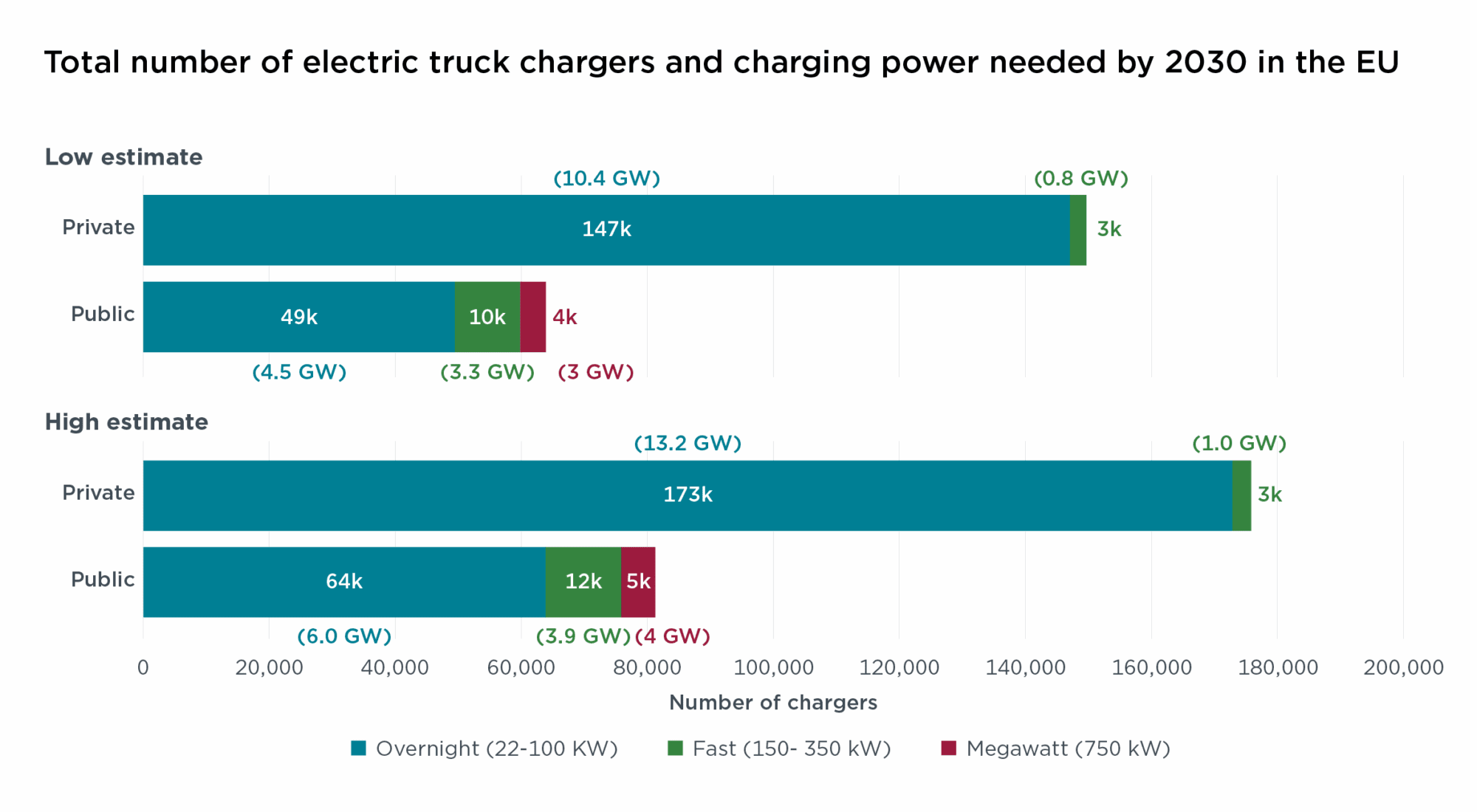 The study shows that overnight charging is expected to be the primary charging mode. By 2030, the EU truck fleet will require 22–28 gigawatts (GW) of charging power capacity. This translates to 150,000–175,000 private chargers and 60,000–80,000 public chargers across the EU. Megawatt chargers comprise almost 15% of the projected installed charging power needs but only 2% of the total number of chargers.