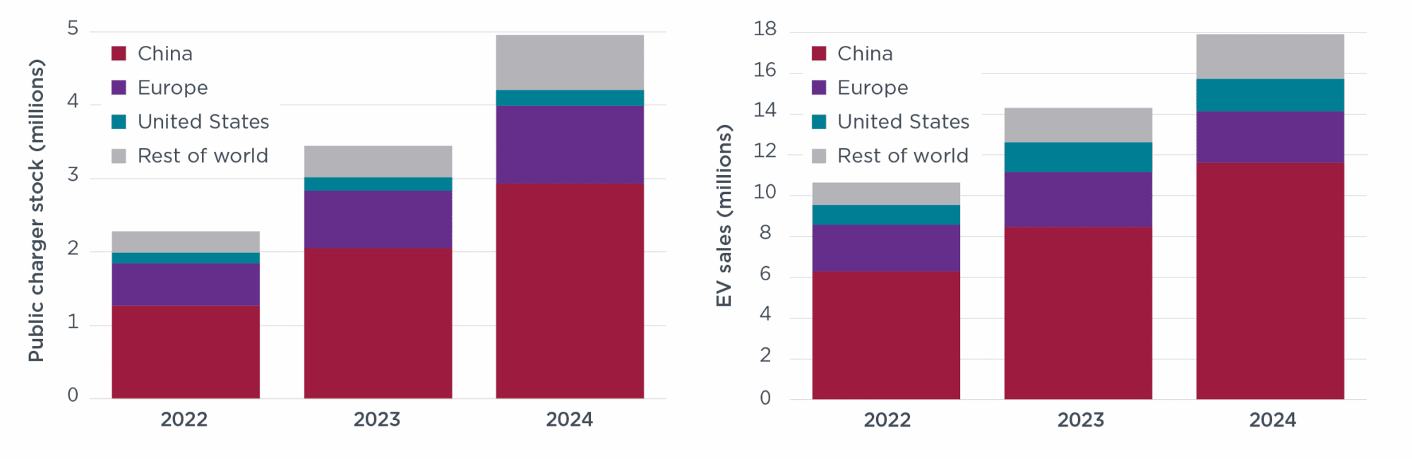 Figure. Global public charger stock (left) and EV sales (right), 2022–2024