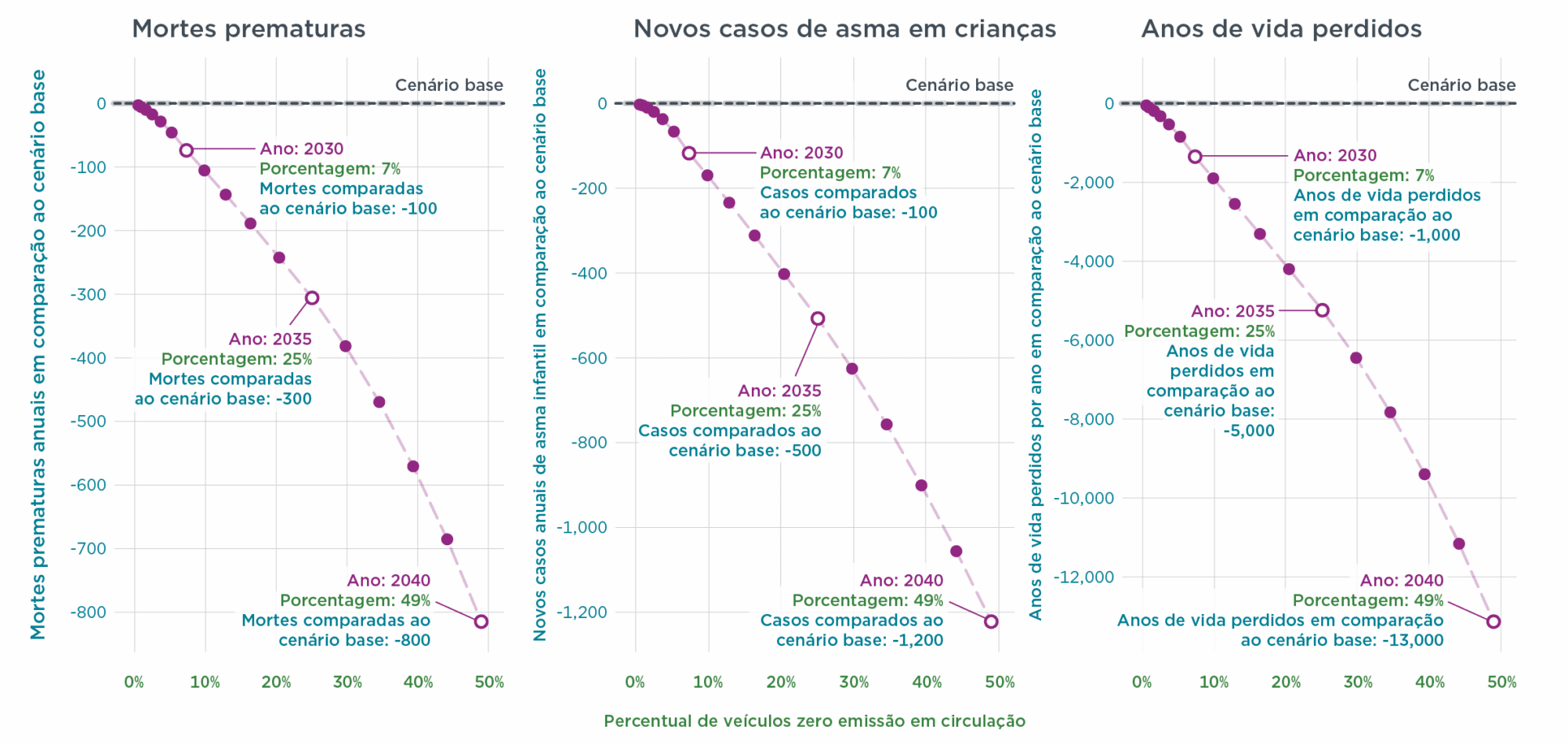 A fruição dos benefícios para a saúde está diretamente relacionada à rapidez com que os veículos elétricos substituem os veículos com motor de combustão interna nas ruas e estradas do Brasil. A figura abaixo mostra que os benefícios para a saúde aumentam proporcionalmente à crescente participação dos veículos com emissão zero (veículos elétricos a bateria ou célula de combustível).