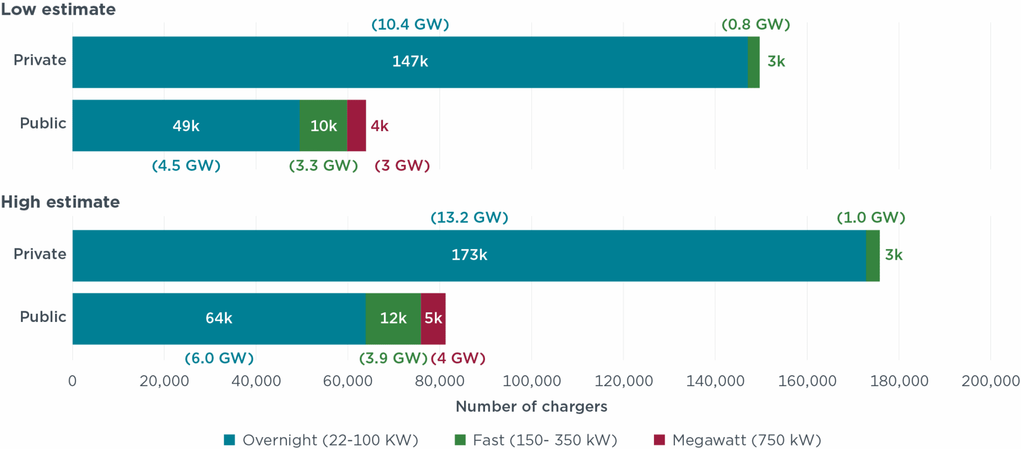 - Overnight charging is expected to be the primary charging mode, while between 4,000 and 5,300 megawatt (MW) chargers are projected to be needed by 2030. MW chargers are expected to comprise almost 15% of the total installed charging power needs, but only 2% of the total number of chargers. Lower-power chargers, such as 350 kW chargers, can cover more than half the public fast charging needs for long-haul trucks.