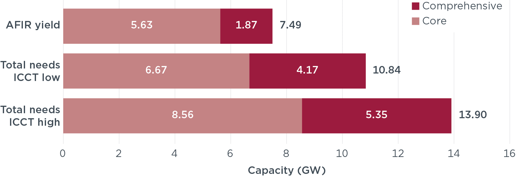 - The AFIR is expected to cover between 50% and 70% of public charging needs in the EU-27 by 2030. Across the core Trans-European Transport Network (TEN-T), the AFIR targets are expected to cover between 65% and 85% of total charging needs, while across the comprehensive TEN-T, the coverage drops to 35%–45%. According to an approximation of state-level AFIR targets based on the extent of the TEN-T network in each state, coverage at the Member State level varies widely. The targets only cover 30%–50% of the expected public charging needs in half of Member States, including countries such as the Netherlands and Belgium, whereas for countries like Romania, the target is twice as high as the expected charging needs.