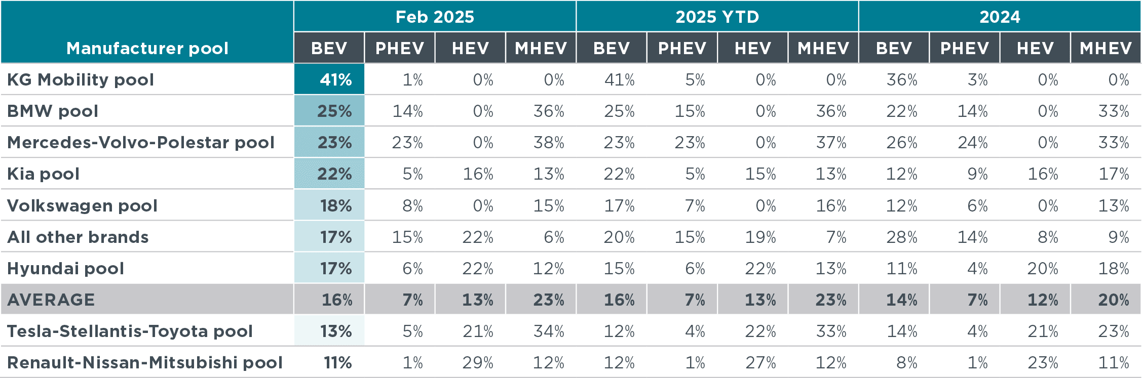 Table 1. Share of battery electric, plug-in hybrid, full hybrid, and mild hybrid passenger cars by manufacturer pool