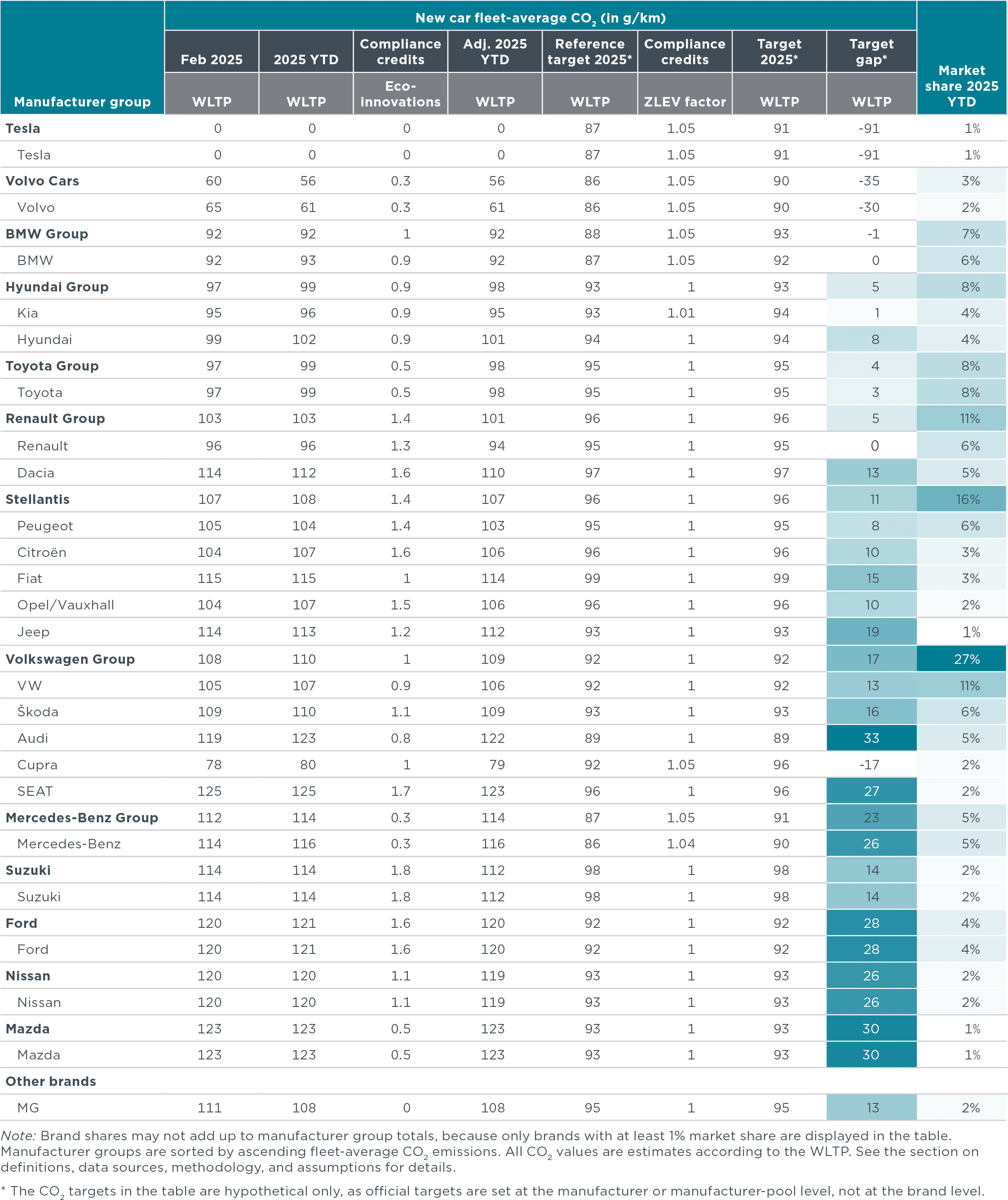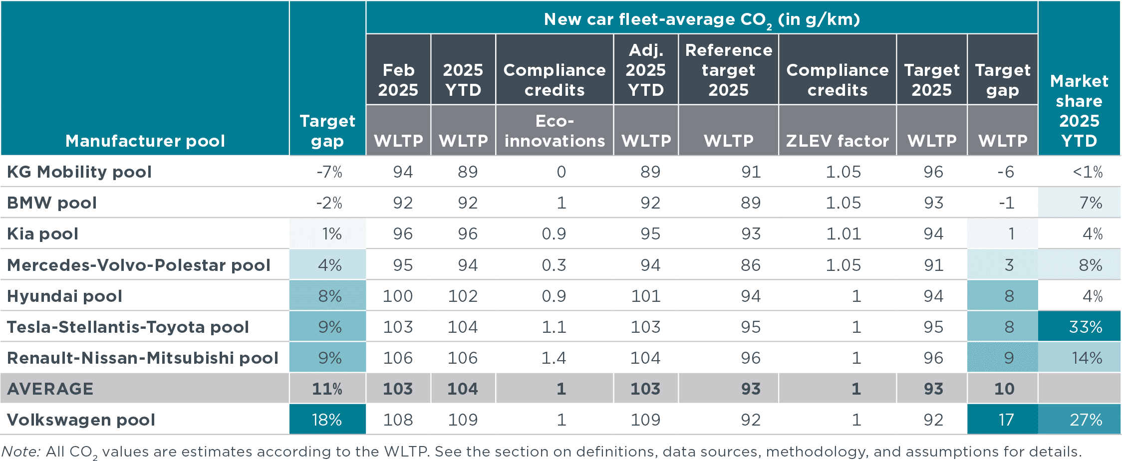 - Manufacturer pools: Automakers are allowed to form pools to jointly comply with CO2 targets. For this publication, the 2025 pools are defined according to the European Commission’s “M1 pooling list,” version of 15 March 2025. The main brands are: BMW pool (BMW, Mini), Hyundai pool (Hyundai), KG Mobility pool (Great Wall Motor, Xpeng), Kia pool (Kia), Mercedes-Volvo-Polestar pool (Mercedes-Benz, Polestar, Smart, Volvo), Renault-Nissan-Mitsubishi pool (Dacia, Mitsubishi, Nissan, Renault), Tesla-Stellantis-Toyota pool (Alfa Romeo, Citroën, Fiat, Ford, Honda, Jeep, Lancia, Leapmotor, Lexus, Mazda, Opel, Peugeot, Subaru, Suzuki, Tesla, Toyota), Volkswagen (Audi, Cupra, Porsche, SEAT, Škoda, VW).