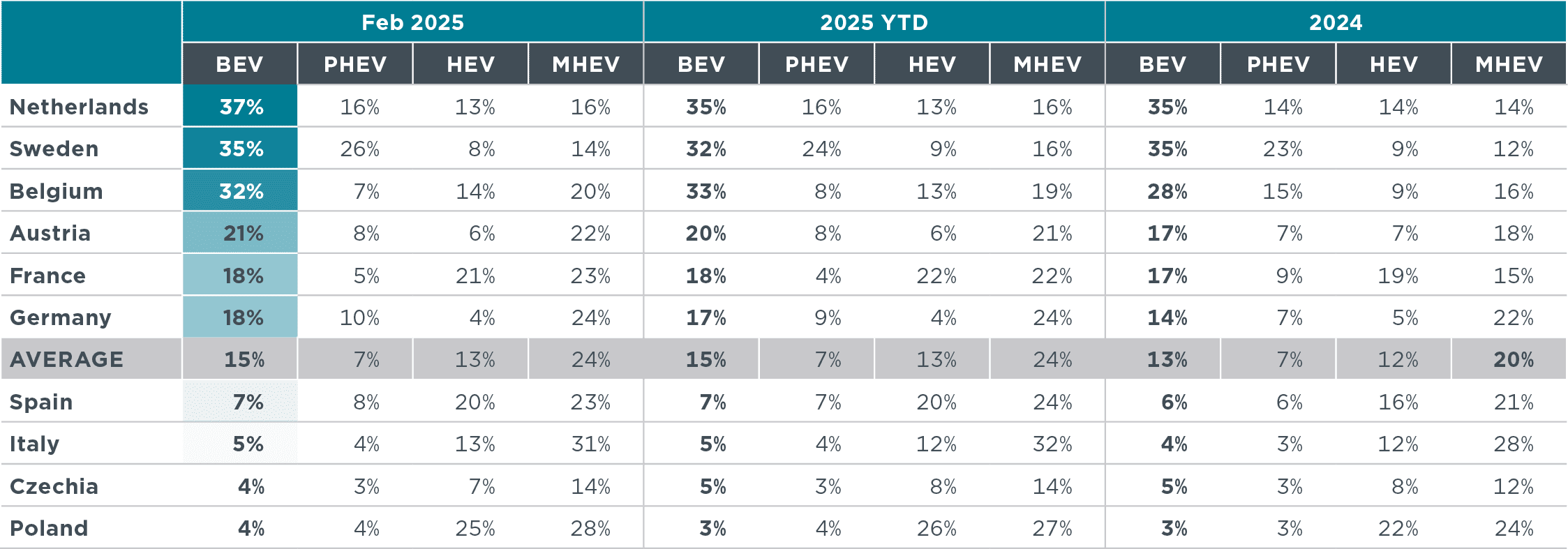Table 6. Share of new battery electric, plug-in hybrid, full hybrid, and mild hybrid passenger cars by country