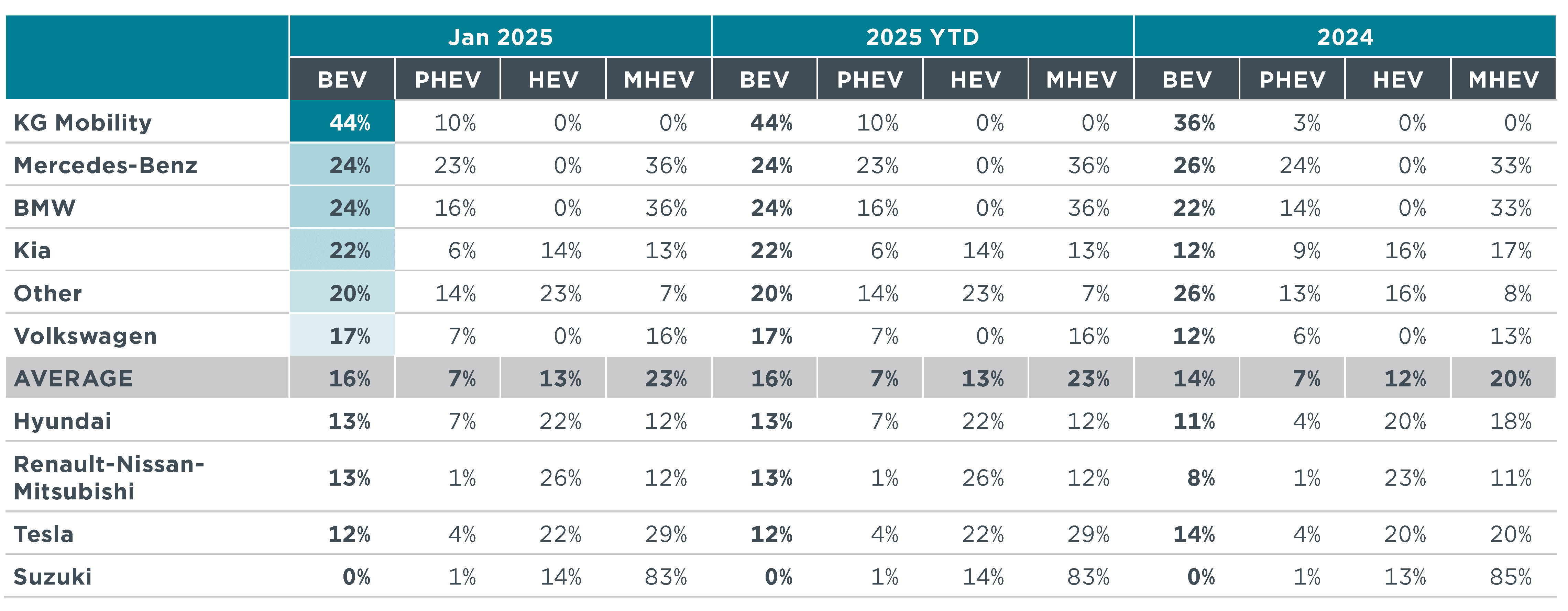 Average carbon dioxide (CO2) emissions (including compliance credits) among manufacturer pools fell substantially in the first month of the year to 103 g CO2/km, down from the average of 107 g CO2/km in 2024. KG Mobility, BMW, and Kia are thus far compliant with their estimated 2025 targets, while Volkswagen (17 g CO2/km above) and Suzuki (13 g CO2/km above) are the farthest from reaching their targets. Manufacturer pools are now only 10 g CO2/km from the average target of 93 g CO2/km for 2025. Looking at individual car brands with market shares of at least 1%, apart from Tesla, Volvo had the greatest over-compliance at 35 g CO2/km below its target for 2025, when projecting the target at the brand level; it was followed by Cupra, which was 15 g CO2/km below its brand-level target. Audi, Ford, and Mercedes-Benz are currently the farthest from their 2025 projected brand-level targets at 35, 28, and 27 g CO2/km above, respectively.