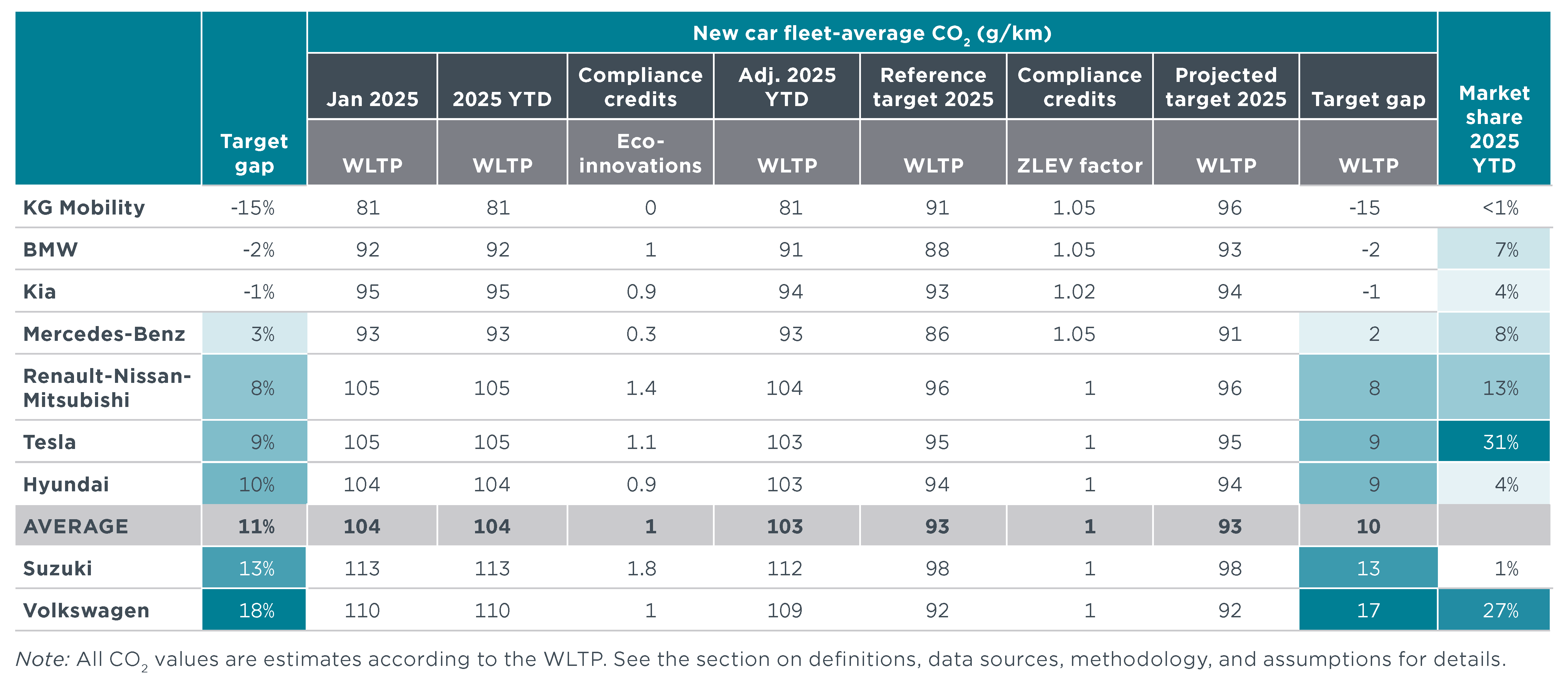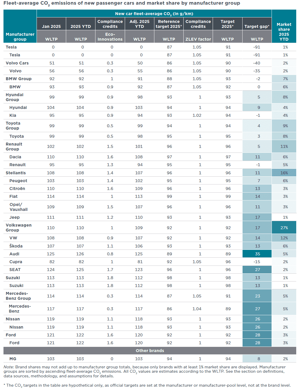 - Manufacturer pools: Automakers are allowed to form pools to jointly comply with CO2 targets. For this publication, the 2025 pools are defined according to the European Commission’s “M1 pooling list,” version of 15 January 2025, as well as the “Declarations of intent to form Open Pools,” version of 7 January 2025. The main brands are: BMW Group (BMW, Mini), Hyundai (Hyundai), KG Mobility (Great Wall Motor, Xpeng), Kia (Kia), Mercedes-Benz (Mercedes-Benz, Polestar, Smart, Volvo), Renault-Nissan-Mitsubishi (Dacia, Mitsubishi, Nissan, Renault), Suzuki, Tesla (Alfa Romeo, Citroën, Fiat, Ford, Jeep, Lancia, Leapmotor, Lexus, Mazda, Opel, Peugeot, Subaru, Tesla, Toyota), Volkswagen (Audi, Cupra, Porsche, SEAT, Škoda, VW).