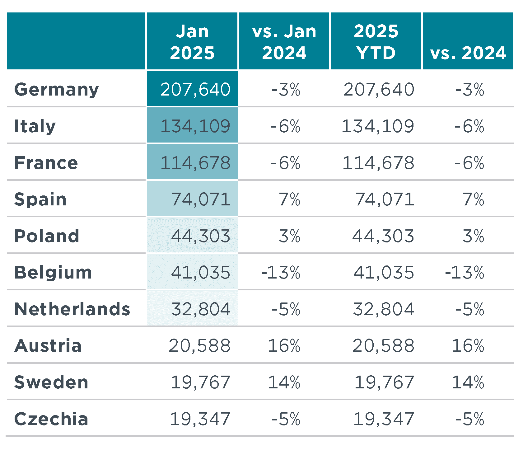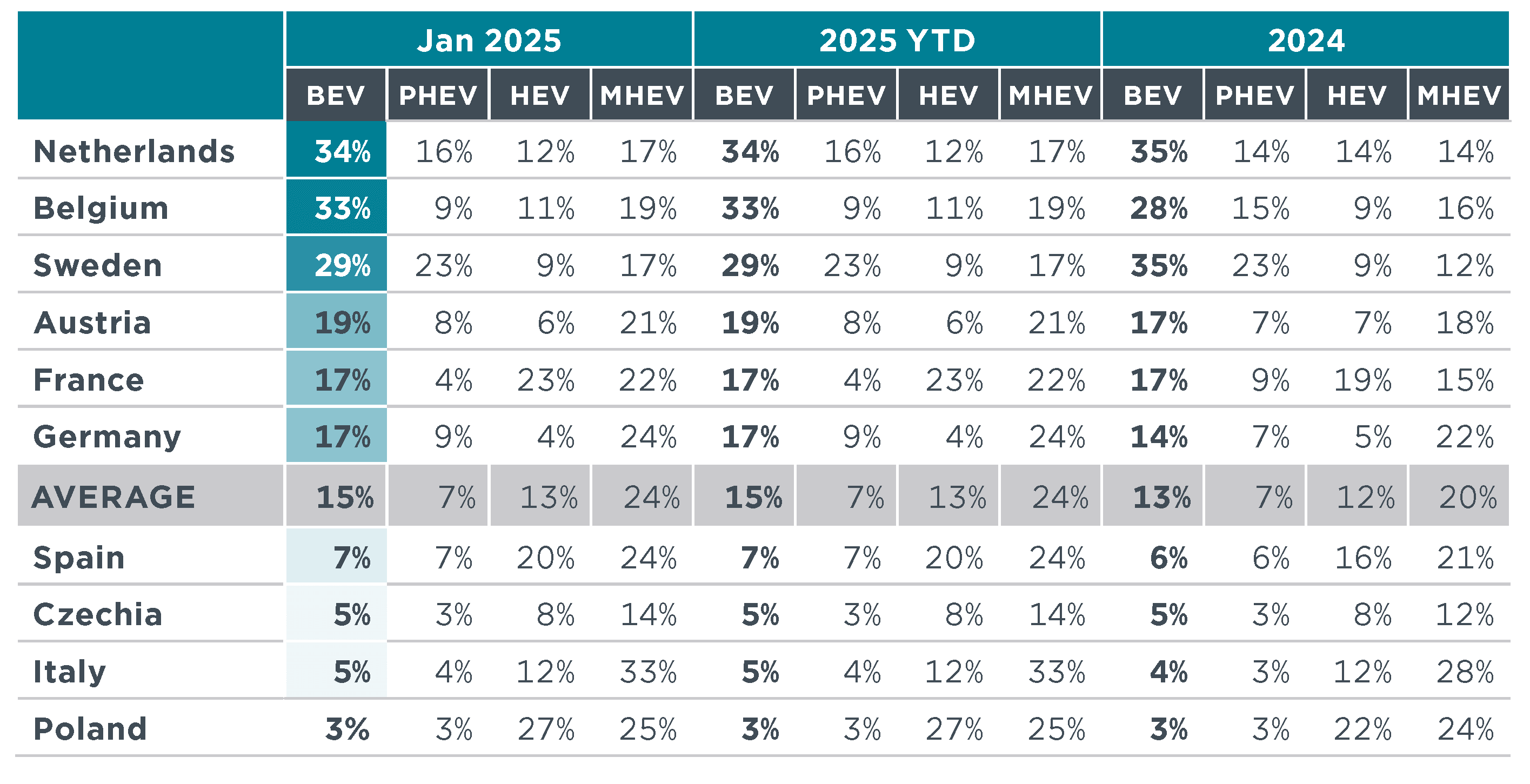 Passenger car registrations in Belgium fell 13% in January 2025 compared with January 2024, and registrations in Austria and Sweden increased by 16% and 14%, respectively. Combined BEV and PHEV market shares averaged 24% in Europe in January 2025, up two percentage points from the average for full year 2024. Norway (97%), Denmark (66%), Sweden (51%), and the Netherlands (50%) all had shares at or above 50%, and Belgium (43%), Ireland (28%), and Germany (25%) recorded combined BEV and PHEV market shares above the average for Europe. The highest increase in BEV registrations occurred in Belgium, where shares increased 5 percentage points in January 2025 compared with January 2024; meanwhile, BEV shares in Sweden dropped 6 percentage points compared with January 2024. Registration shares of PHEVs were the highest in Sweden (23%), HEV shares were highest in Poland (27%), and MHEV shares were highest in Italy (33%).