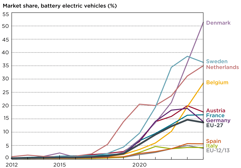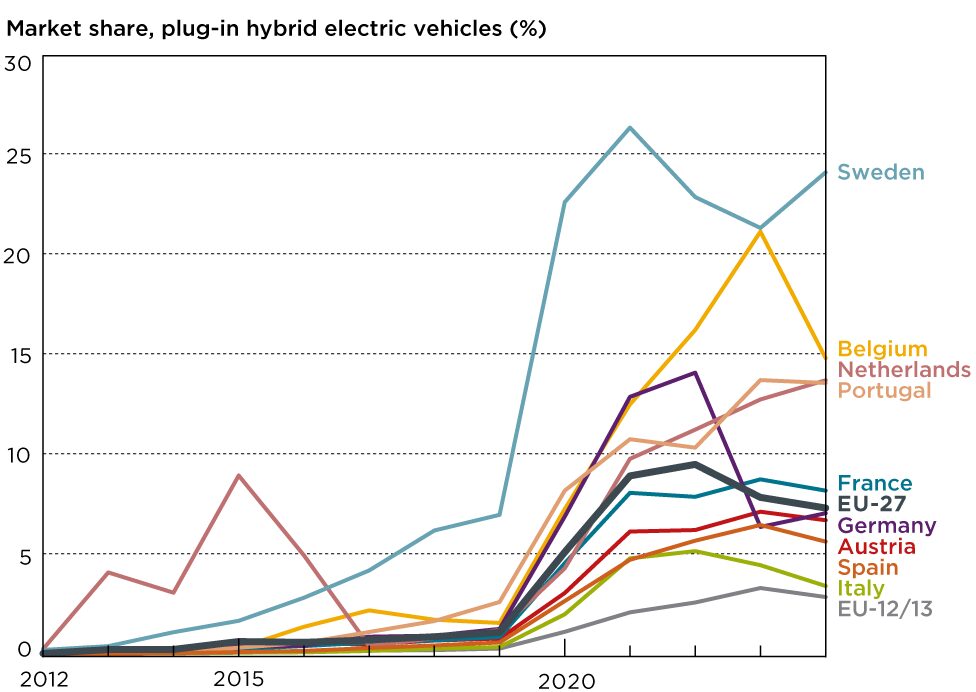 While most newly registered passenger cars in the EU-27 are still powered by gasoline or diesel engines, battery-electric vehicles (BEVs) made up nearly 14% of new registrations in 2024, and plug-in hybrid electric vehicles (PHEVs) accounted for about 7%.