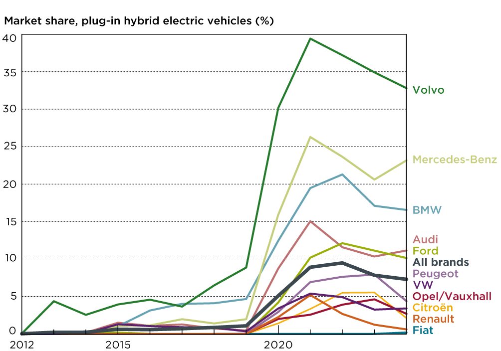 PHEV uptake varied widely by country, with particularly high shares in Sweden, Belgium, the Netherlands, and Portugal. Among manufacturers, Volvo continued to lead in PHEV penetration, with PHEVs making up 33% of its 2024 registrations.