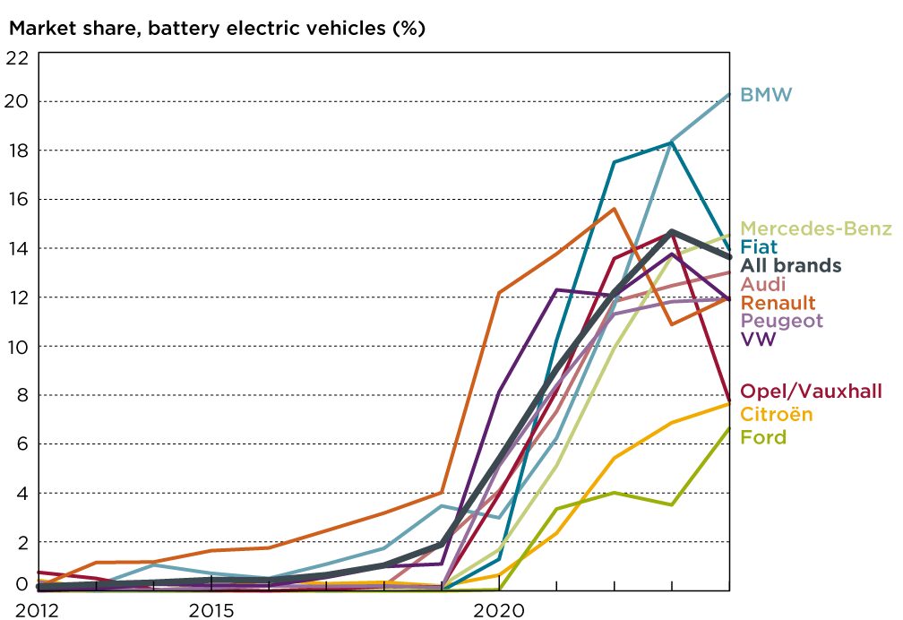 The BEV share continued to grow in Denmark (51%), the Netherlands (35%), and Belgium (29%), and remained high in Sweden (36%) despite a slight year-on-year decline. Among major manufacturers, BMW had the highest BEV share in 2024, with BEVs representing 20% of its new registrations.
