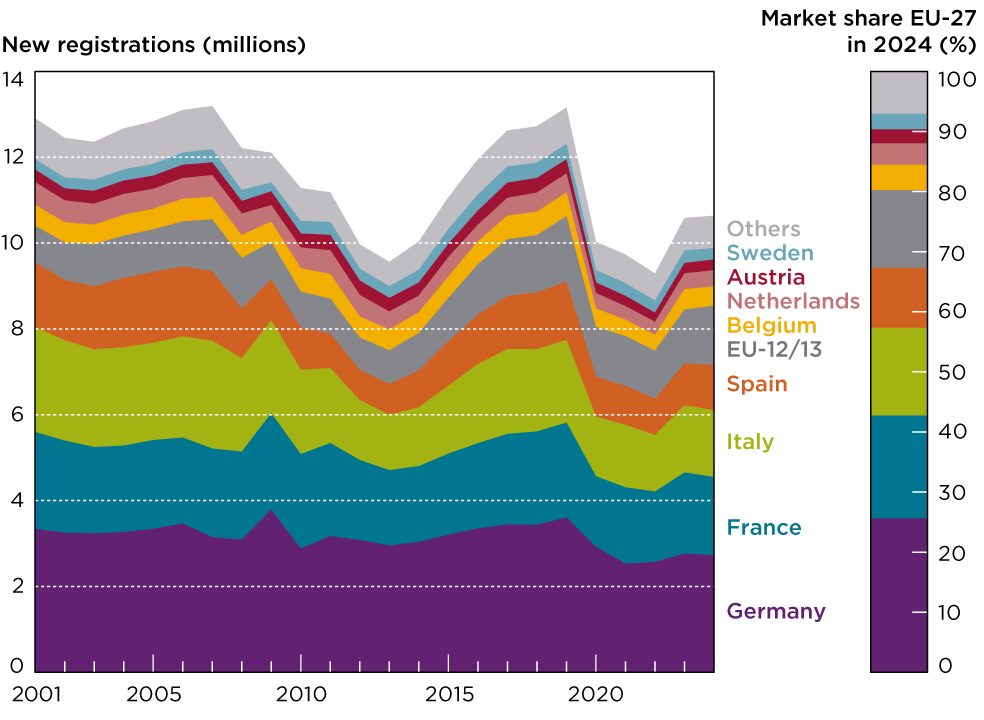 With just over 10.6 million registrations, the number of newly registered passenger cars in the EU remained stable in 2024, following the rebound seen in 2022 and 2023. Spain (+8% compared with 2023) and Austria (+6%) recorded the strongest growth, while Sweden (−9%) and Belgium (−6%) saw the largest declines. Germany remains the EU’s largest vehicle market, accounting for 26 % of all registrations in 2024.