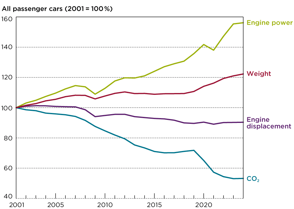 While the average CO2 emissions for new cars in the EU, as assessed by the official test procedure, have decreased by about 47% since 2001, vehicle weight has increased by 22% and engine power has increased by 56%.