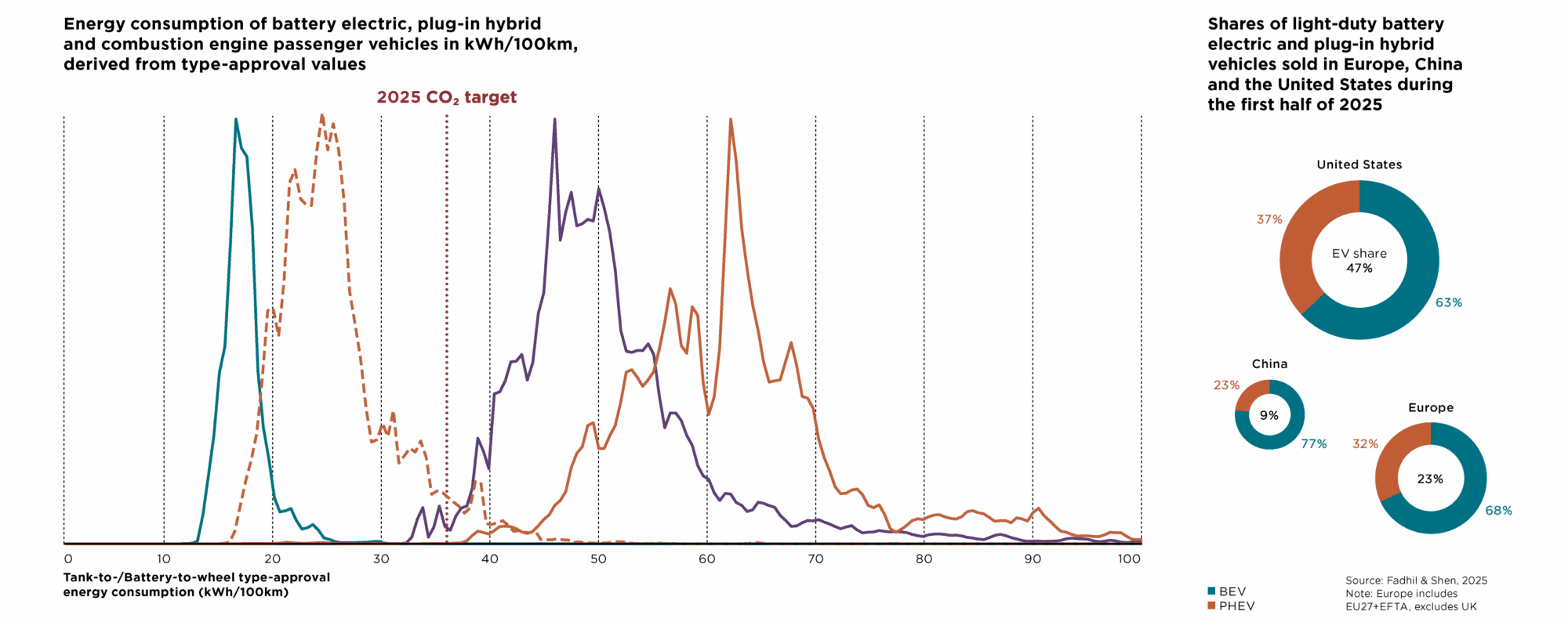 PHEV uptake varied widely by country, with particularly high shares in Sweden, Belgium, the Netherlands, and Portugal. Among manufacturers, Volvo continued to lead in PHEV penetration, with PHEVs making up 33% of its 2024 registrations.