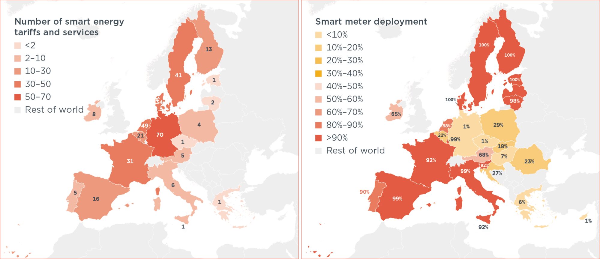 Figure. Number of smart energy tariffs and services (left, early 2025) and smart meter penetration (right, 2024) in Europe