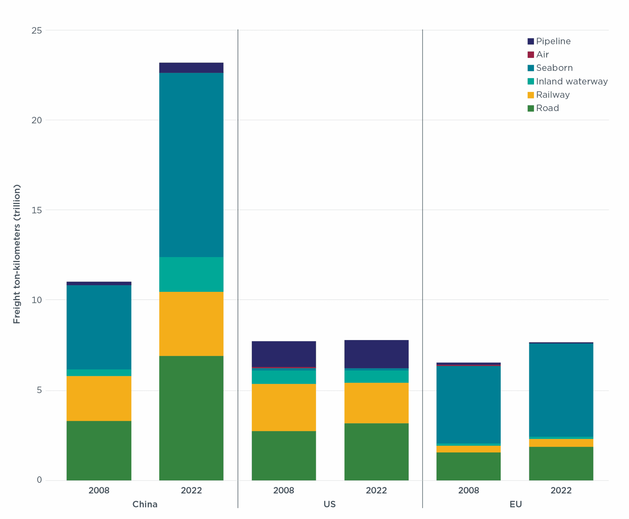 Still, in recent years, road freight has become increasingly popular. Road freight’s share of total freight ton-kilometers in China, the United States, and the European Union increased significantly from 2008 to 2022, by 110%, 16%, and 24%, respectively. While the share of road freight increased, the share of railway and inland waterway dropped.