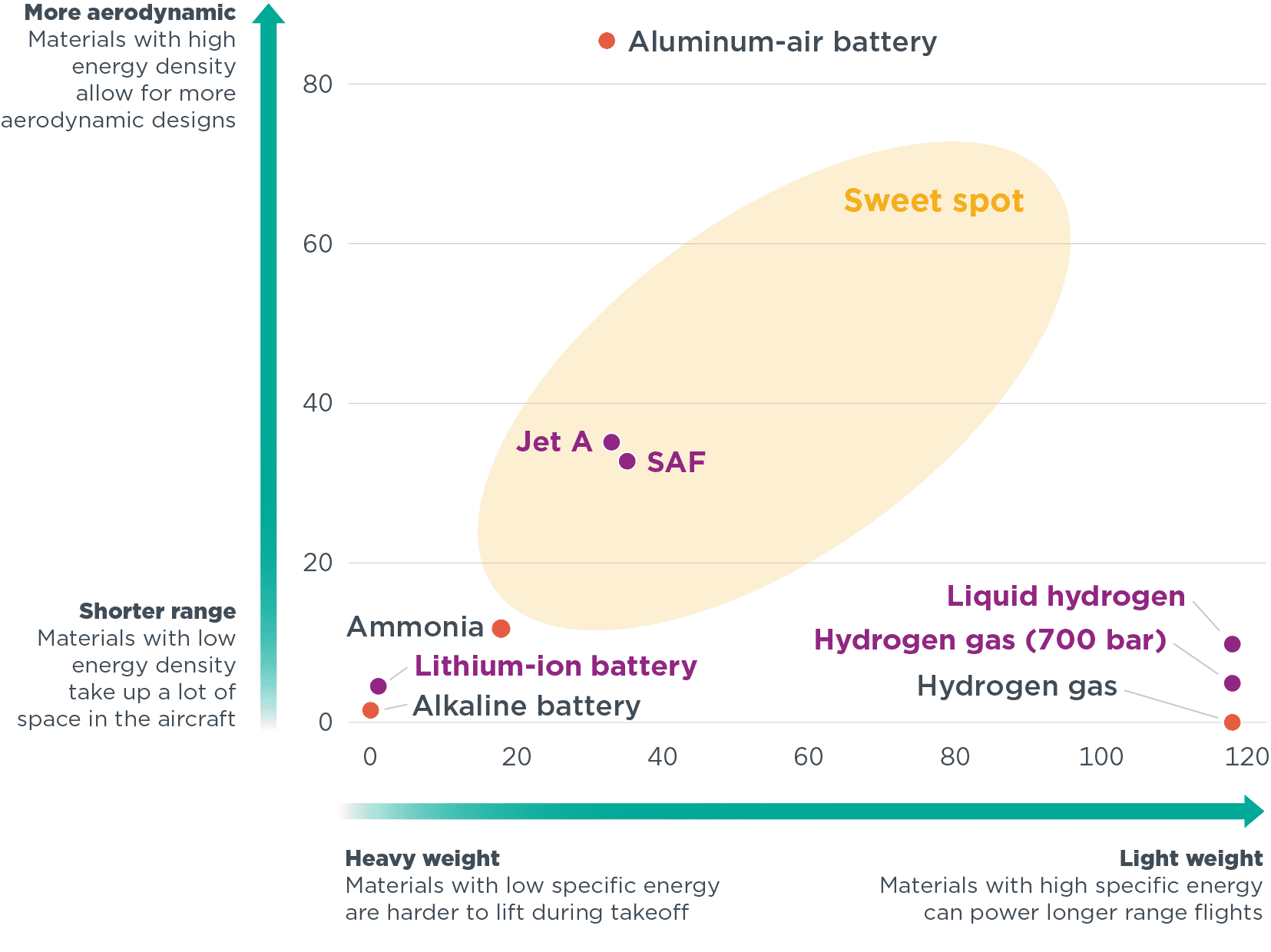 Aircraft require lots of energy to overcome the gravitational and aerodynamic forces required for flight. Consequently, the energy source needs to be light and compact to reduce those forces. As shown in Figure 1, liquid hydrocarbon fuels, a term used to encompass Jet A, bio-derived SAF, and synthetic fuels, have the perfect combination of specific energy (43 MJ/kg) and energy density (about 34 MJ per liter) for use in aircraft. Current lithium-ion batteries at the pack level achieve 0.9 MJ/kg and 1.8 MJ/L, far worse than liquid hydrocarbon fuels on both counts. Although hydrogen has a specific energy nearly three times as high as jet fuel (120 MJ/kg), it occupies 4–7 times more volume per unit energy (5–8.5 MJ/L), depending on the method of storage.