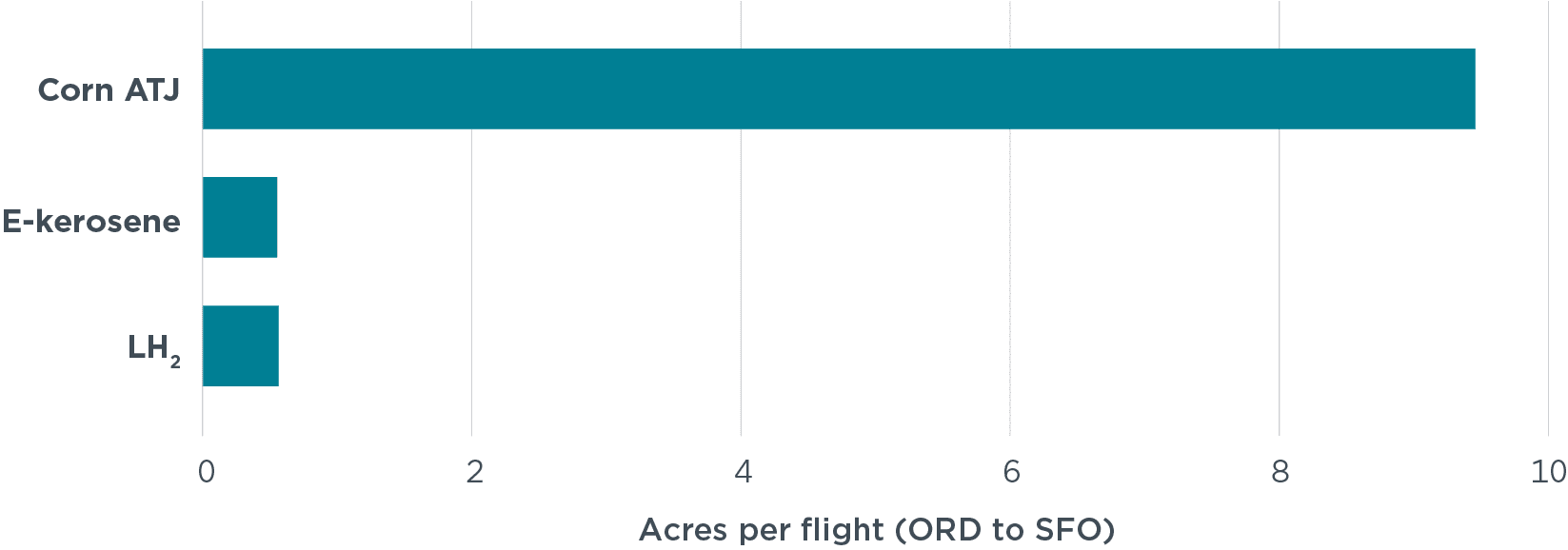 The resource consumption extends beyond energy use, because there can be extensive land-use implications with SAF depending on the feedstock used to produce it. For example, an acre of land used to grow corn, a feedstock for alcohol-to-jet (ATJ) SAF, would likely produce 30 times more energy if it were instead used to harness solar energy. One flight between Chicago O’Hare airport (ORD) and San Francisco airport (SFO) would require over 9 acres of land to fuel using corn ATJ fuel, while hydrogen- and e-kerosene-powered aircraft would take less than 1 acre of land to source the energy needed to complete the same flight (Figure 2). Multiple analyses have suggested that the limited availability of arable cropland greatly constrains the potential for crop-based SAF to provide a meaningful share of global aviation fuel demand.